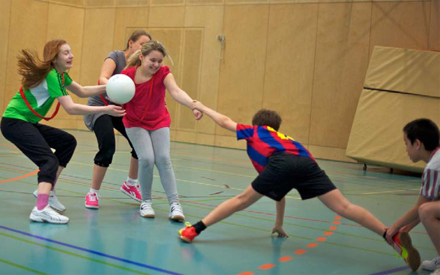 Lehrunterlagen für den Sportunterricht: Völkerball. Dieses Spiel ist eine interessante Variante der Grundform. Zwei Mannschaften vern sich mit zwei (Variante: drei oder vier) Bällen abzuwerfen.